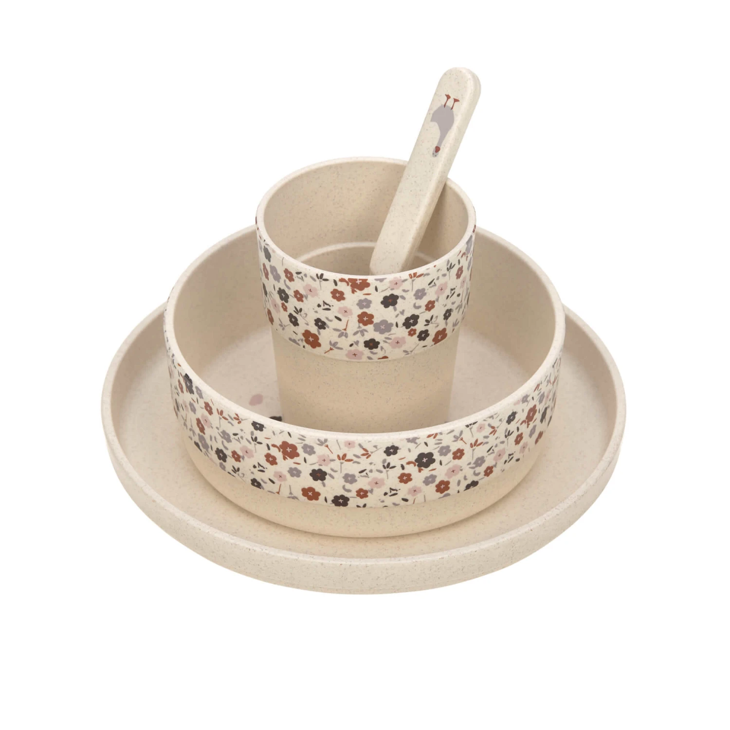 L’ensemble est composé d’une assiette, d’un bol, d’une tasse et d’une cuillère.
