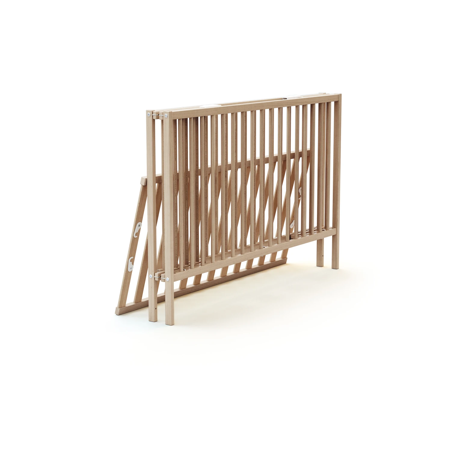 Lit pliant 60 x 120 cm. Un lit pliant en bois compact et pratique pour offrir un grand confort de sommeil aux bébés (sommier à lattes en hêtre massif) et se ranger facilement. Sécurité garantie grâce à ses 2 manettes de verrouillage.