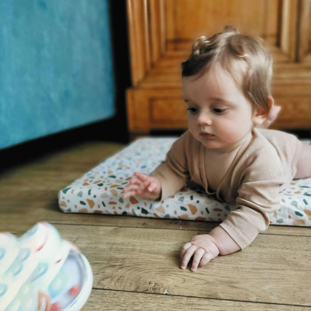 - Posez-le à l’extérieur : Positionné au sol, vous pouvez l’utiliser comme un tapis de jeu pour bébé. Le dessous PVC vous permet de le garder au sec et de le nettoyer en un tour de main. Le PVC a l’avantage de faire barrière entre le froid du sol et bébé.