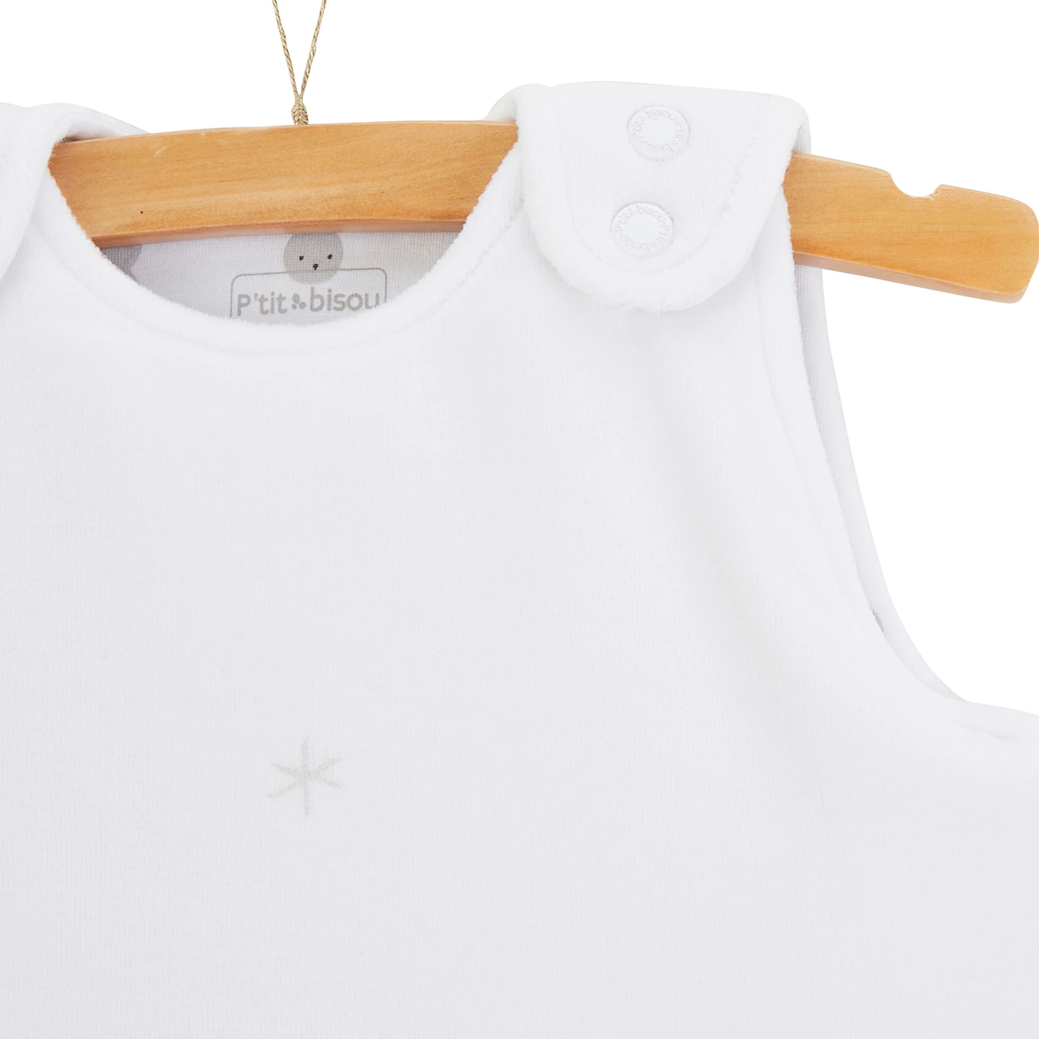Gigoteuse P’tit bisou en velours blanc adaptée pour les tous petits de la naissance au 3 mois en taille unique. Cette gigoteuse est chaude et confortable avec un TOG = 3,5 donc à adapter à la bonne température de la chambre de bébé. Elle est ouatinée mais aussi doublée de jersey blanc imprimé de petites têtes de lapin grise.